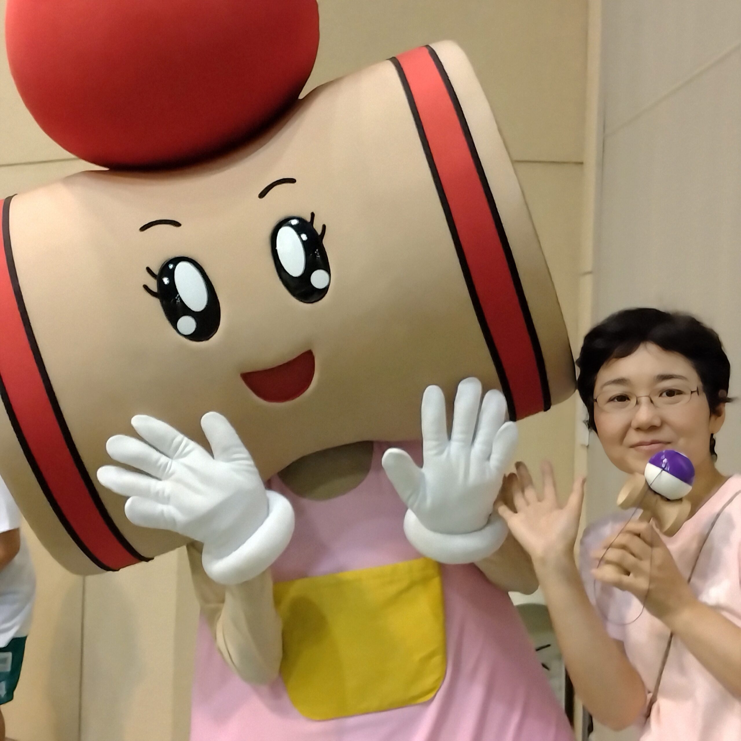 ▲けん玉発祥の地・廿日市市のマスコットキャラ「たまちゃん」と一緒に(辻志穂さん)