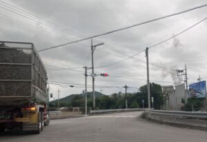 ▲製糖工場(右側、煙が出ているところ)へ、トラックで運ばれるサトウキビ