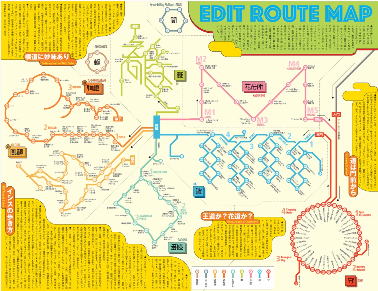 イシス編集学校の全ての講座のお題タイトルが一覧できるコースマップ。電車の路線図に見立てて仕上げられている。