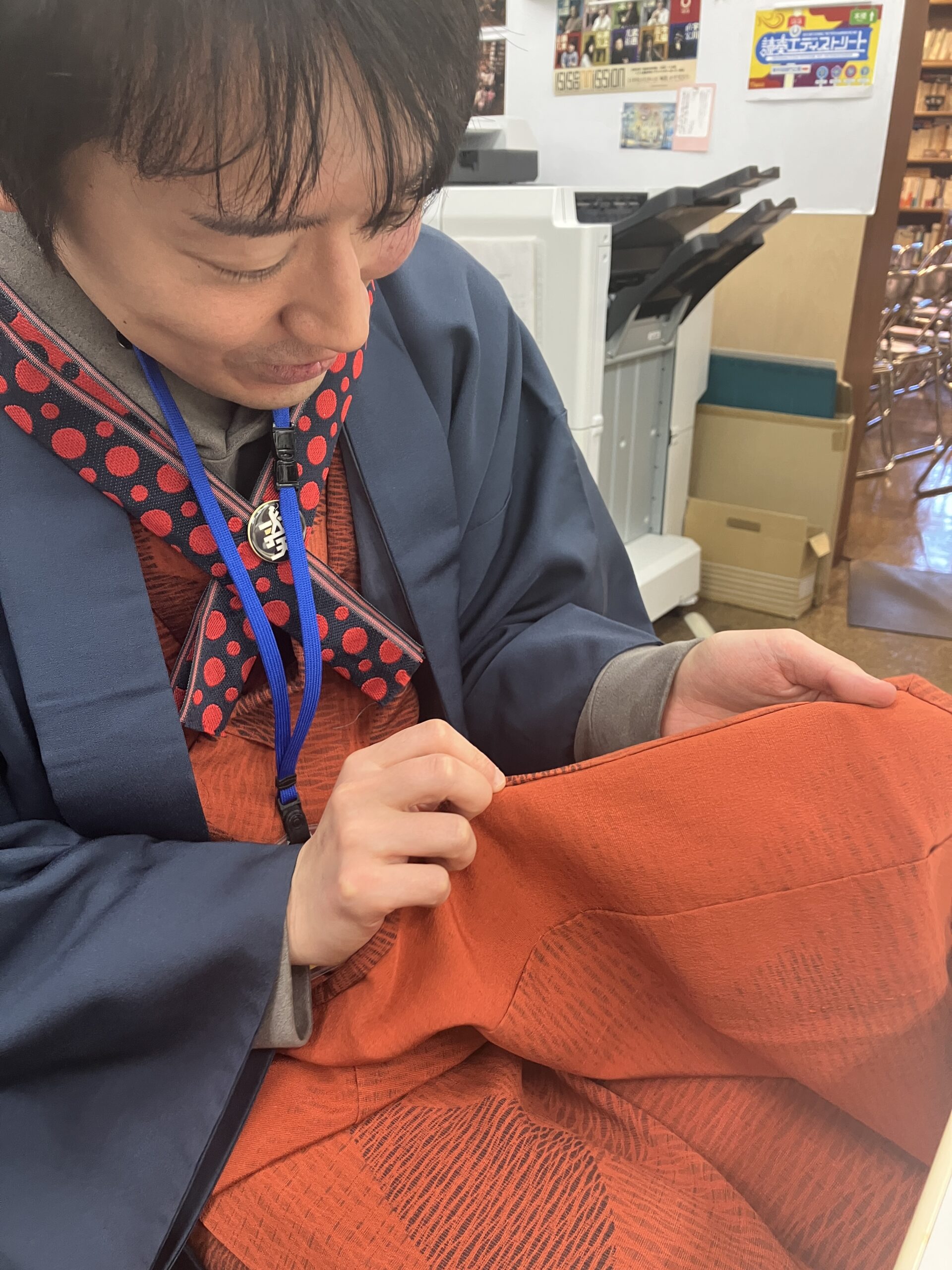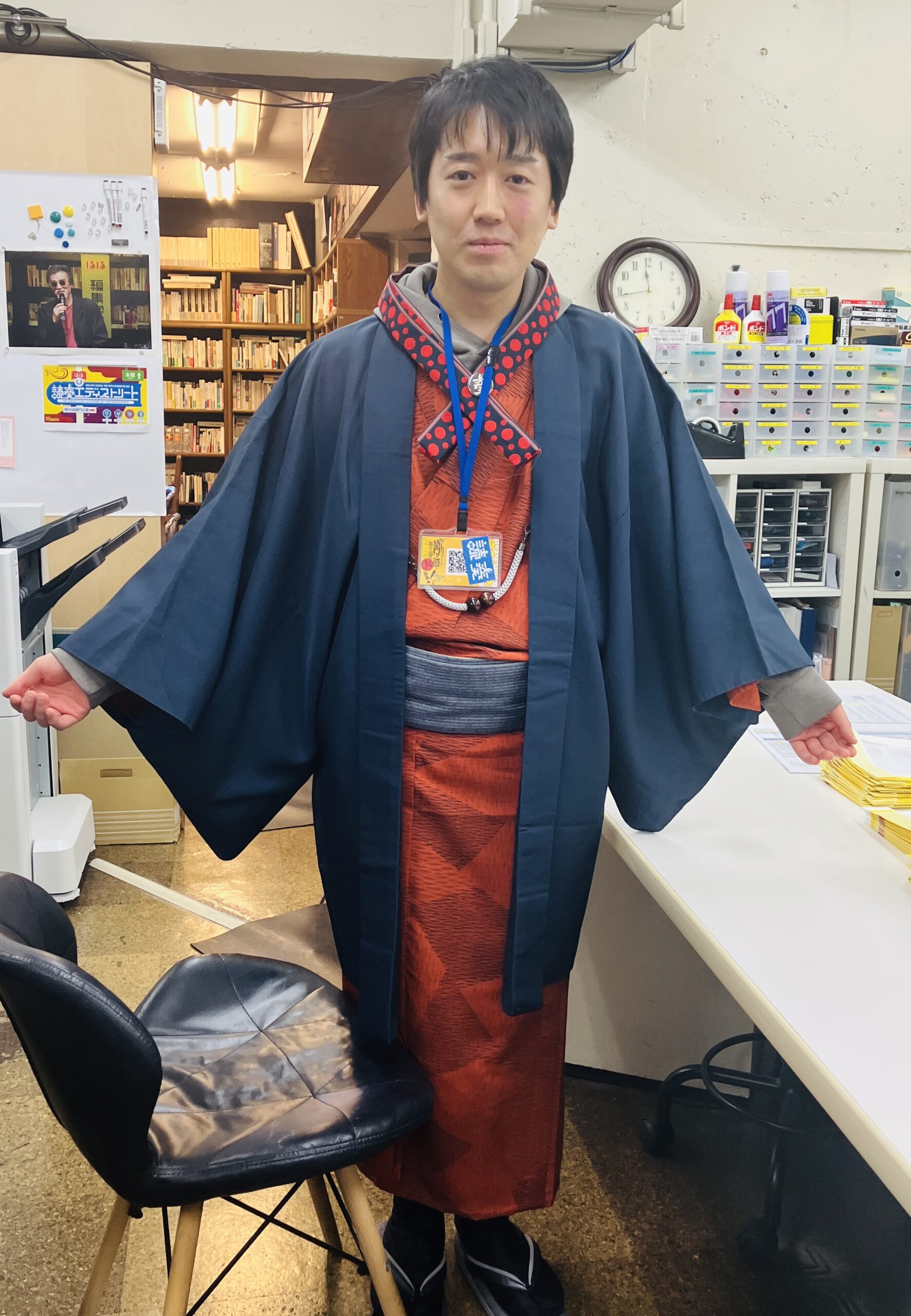 緋色の着物に紺の羽織を重ねるコーディネートは、情熱的なのに知的さを失わない中村響事にピッタリだ。第90回感門は当期(44[花]客人錬成師範)でもあるので、華やかな色合いの布を選んだと言う。菱紋でも鱗紋でもない図形がデータサイエンティストとしての中村の解析心をくすぐるのだろうか。しかしこの模様、洋服では柄合わせが鉄則だが、和装の柄合わせは粋ではないと言う。敢えて柄をズラすことに編集の妙味を感じる。