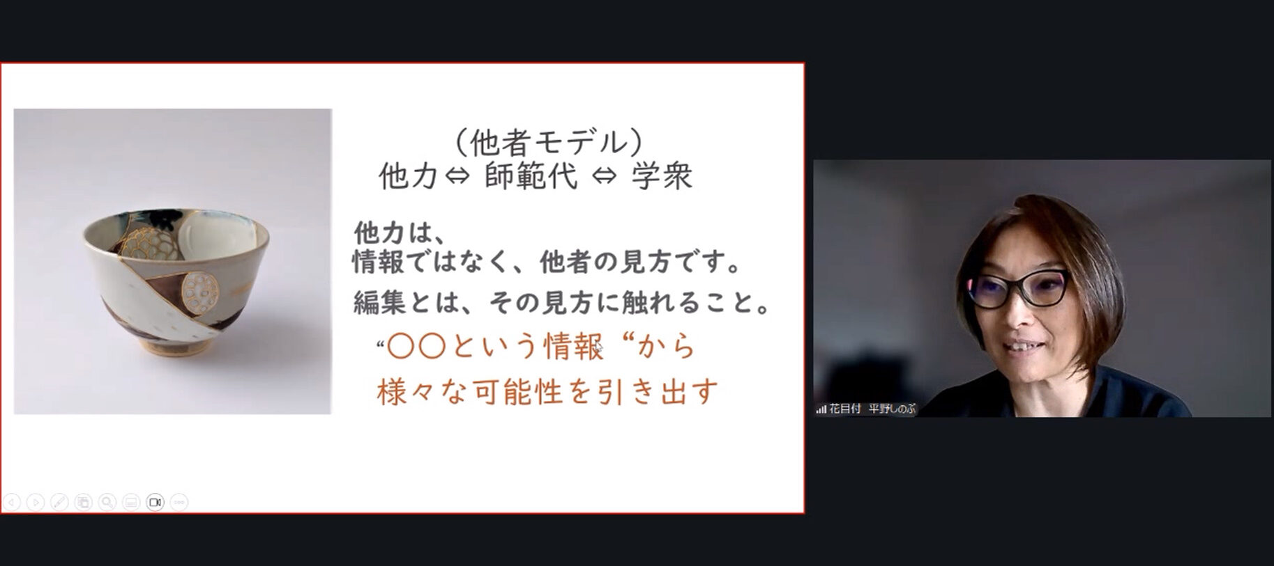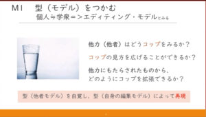 ツアーの冒頭で流れていた校長・松岡正剛が登場する「オトナの!」映像のように、基本コース・守講座では「コップ」に関するお題があり、生徒役の学衆が回答を教室にアップします。教える側の師範代は教室に飛び交う他者の回答を読み、使われている方法の型を取り出しつつ、回答した本人すらも気づいていなかった見方や問いを手渡しています。師範代は「あるもの」を足すのではなく、「ないもの」を使って可能性を拓くことを平野は強調していました。