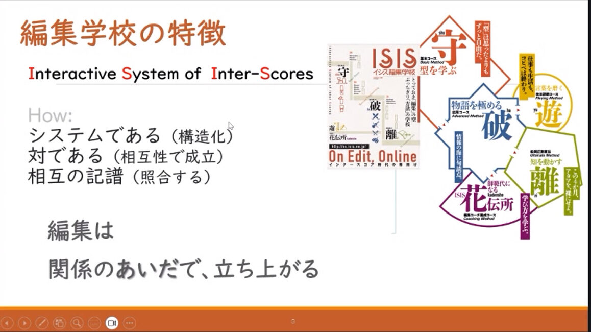 まもなく春を迎える如月最終日の28日の昼、イシス編集学校の編集コーチ養成コースであるISIS花伝所のオンラインツアーが行われました。応用コースの破講座や物語講座などを受講し、師範代の指南の秘密について興味を持った方々が集まりましたね。