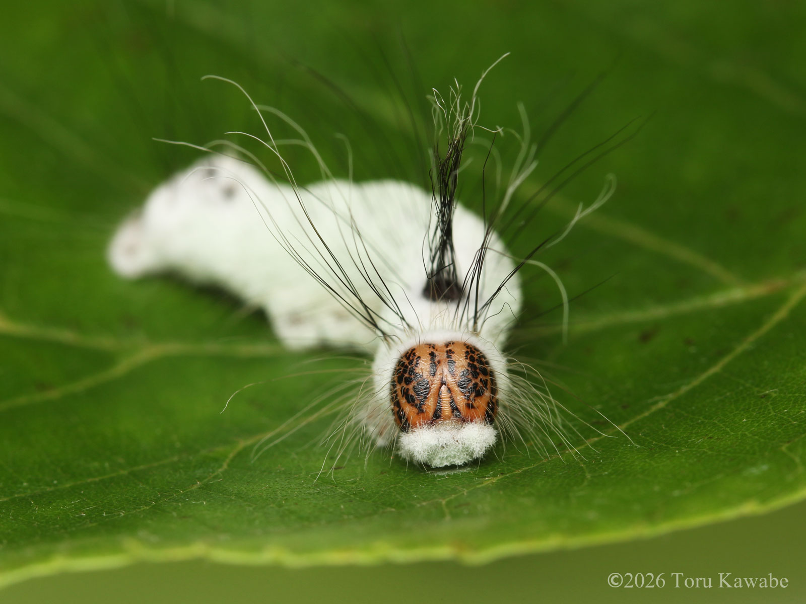ハンノキの葉のうえで、総身を白い菌に侵されて命を終えていたキハダケンモンの幼虫。見なかったことにしてしまいたくなるこんな存在も、アングルを変えてレンズを向けてみると、メルヘン世界の住人に様変わりする。