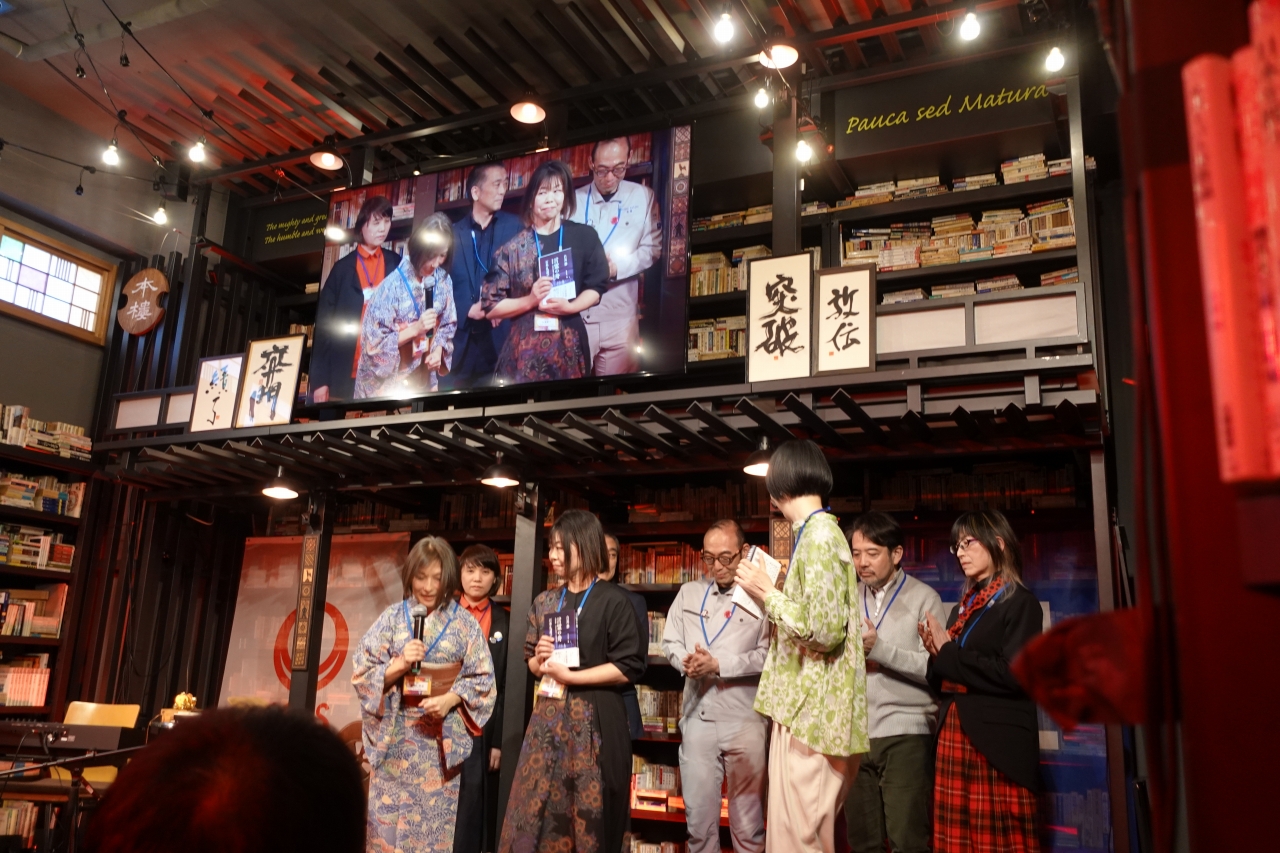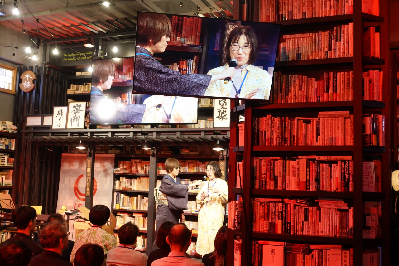 校長・松岡正剛が残した「花伝」の書は126通りだ。生前、花伝所の師範に贈る「花伝扇」に書かれた数になる。校長が書いた文字が今回も投影されている。