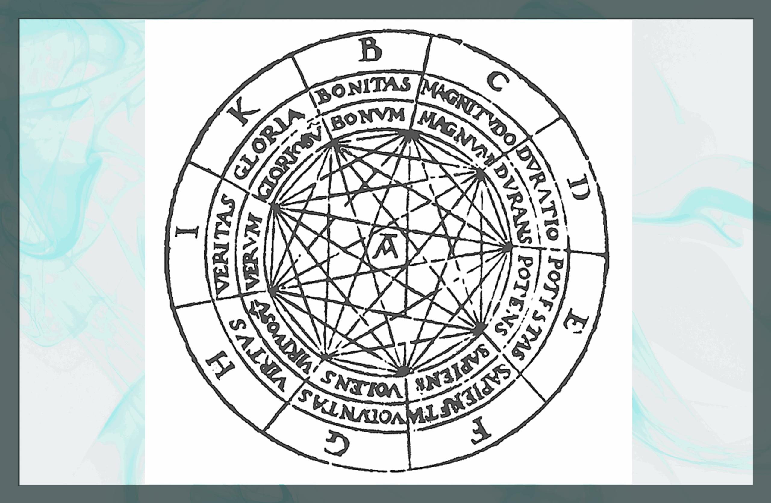 ルルスのアルス・マグナ。数個の究極概念を円盤に刻み回転させ、その組み合わせによって神学的世界観の全てを記述する概念道具である。ライプニッツのローギッシュ・マシーネはこの発展形で、言語を神の祈りから切り離し論理と計算の秩序に変換した。AIはこの論理機械の末裔にあたる。しかし後期ウィトゲンシュタインは、言葉は生きた人々の関わりの中で働く(言語ゲーム)と考えたため、機械的な論理操作の果てには倫理の在処を見出すことができなかった。 一方現代社会では、AIの学習ソースとなるデータセットから性的・暴力的コンテンツを削除するため、大量にそうしたデータを閲覧する過酷な労働が社会的弱者に押し付けられている問題が指摘されている。遷移確率行列の中のどの値が「悪魔」なのか、その価値づけはまだ人間しか行うことができない。生成系AI=全自動言語ゲーマーという現代のローギッシュ・マシーネは理性の権化として君臨しつつ、その土台は血の通った人間の犠牲によってできている。AIに対する倫理の倫理的実装方法を、人類はいまだ開発できていない。