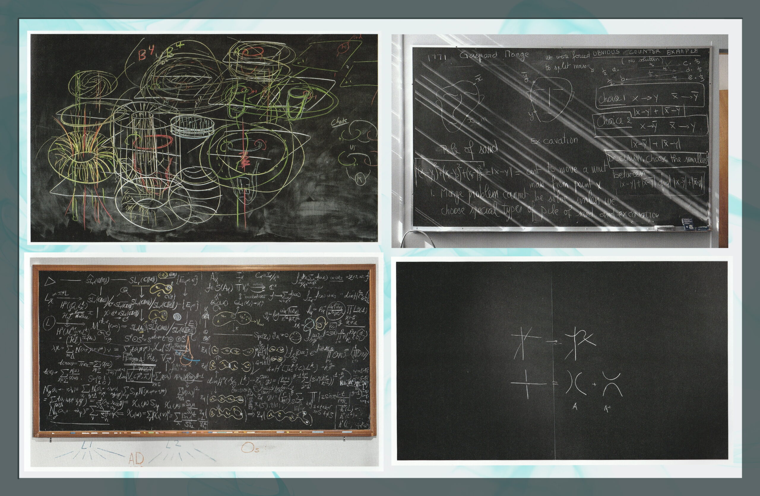 Jessica Wynne(2021)『数学者たちの黒板』草思社より抜粋。「シメスを空間固定する」方法。数学者にとって、黒板は空っぽのキャンバスであり、そこに言葉や数式という絵の具を塗ることで、先行する思考のイメージをあらわしてゆく。