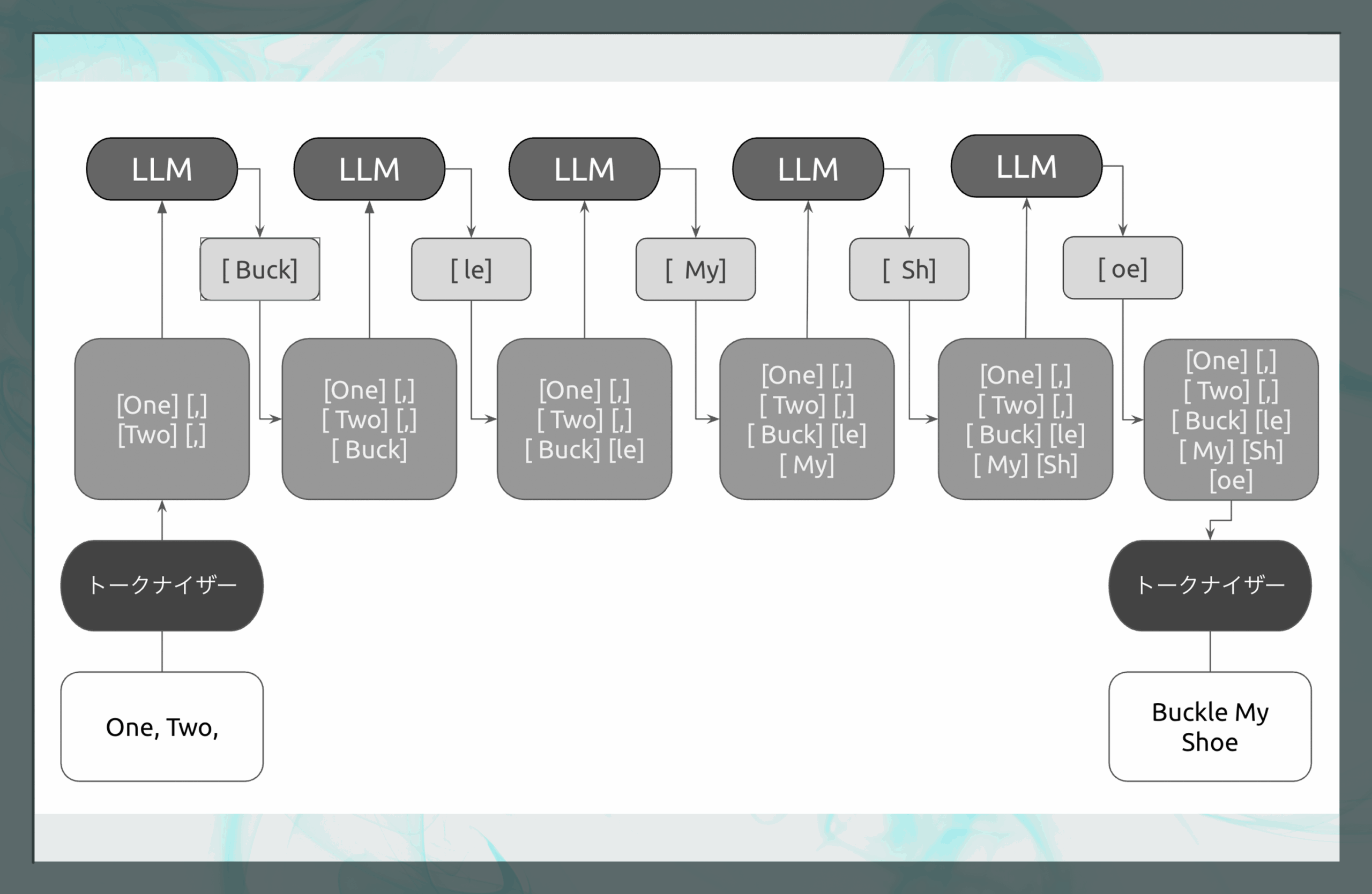 LLMは入力された文章を一文字ずつではなくトークンと呼ばれる複数文字が連なる単語(チャンク)に分解して処理する。この図は”One, Two, Buckle My Shoe.” という英語圏で有名な童謡の一節を出力する推論プロセスを表している。入力に “One, Two”を受け取ったLLMは、文字列を単語に分ける機能(トークナイザー)を経て、次に来る確率の最も高い”Buck”を出力し、次は”One, Two, Buck”を入力として”le”を出力し、次は”One, Two, Buckle”から”My”を出力し…と繰り返していく。 John Berryman, Albert Ziegler(2025)『LLMのプロンプトエンジニアリング』O’REILLY ジャパン p31の図を元に見やすく修正したもの。