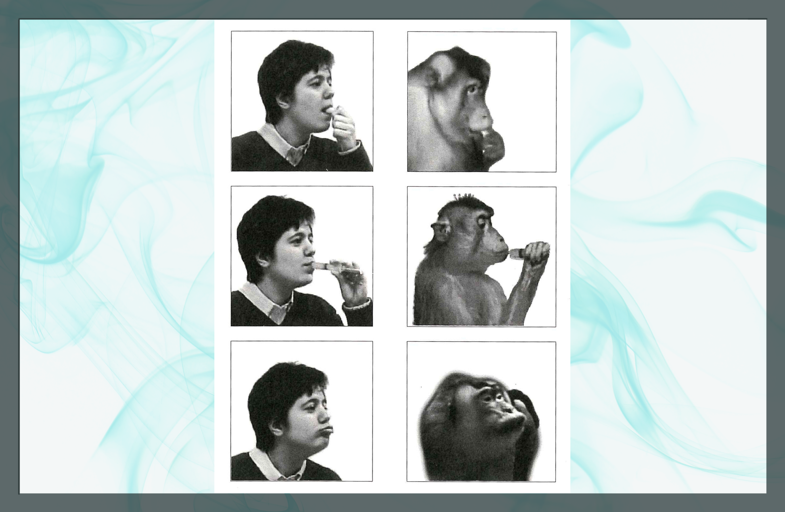 『ミラーニューロン』より。実験者による食べ物をくわえ、注射器からジュースを飲み、唇を突き出す行為を猿が真似ている。ミラー・ニューロンが活性化する共通項として摂食に関わる手と口の動きに反応することが知られている。
