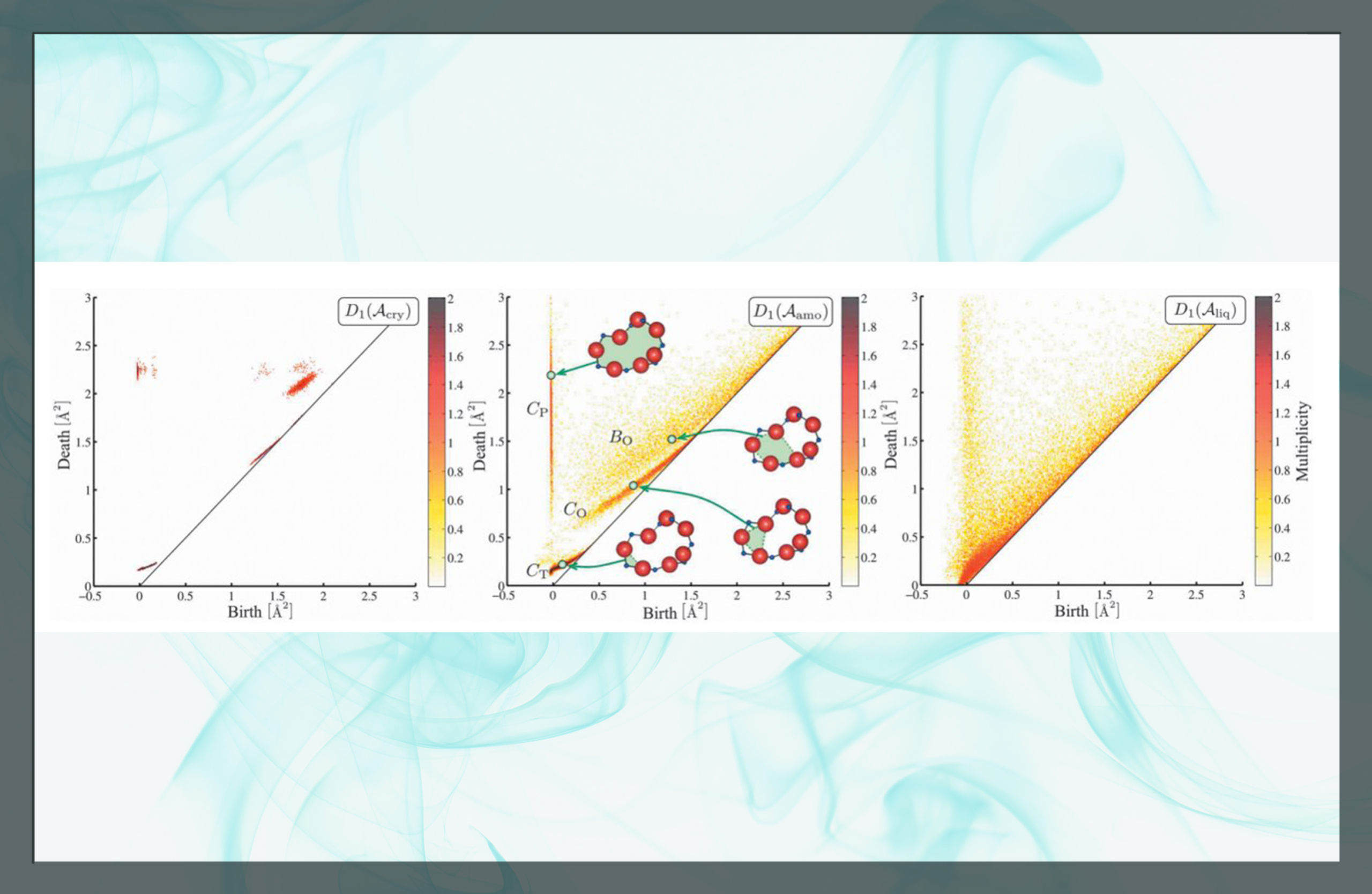 平岡・西浦論文に掲載された1次パーシステント図。左が結晶、中央がガラス,右が液体の状態の二酸化珪素(SiO₂)を表している。 二酸化珪素は窓や瓶などに使われるガラスの主成分である。このガラスの原子配列は、局所的には一定の並び方をしているのに、全体として眺めると規則性がないように見える不思議な構造をしている。 平岡らは、この原子配列を三角形や輪っかの集まりとして数学的にとらえ直し、ホモロジーという方法で「どんな輪っかがどの大きさで生まれ、どの大きさで消えるか」を計算した。その結果をまとめたものが上図であり、肉眼では見えないガラス特有の構造パターンを浮かび上がらせている。 こうして「形」を数学の世界の対象(式やベクトル空間)に写して比べることで、人間の目では結びつかない構造どうしの共通性や違いをとらえる、というのが擬同型や計算ホモロジーの発想なのである。