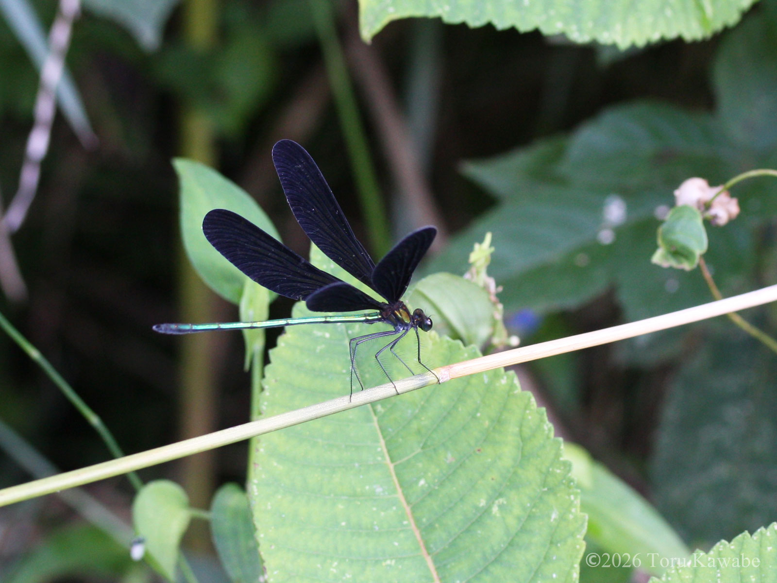 小川の水底での波乱万丈を生き抜き、無事に変態を遂げた後は人家の周りにもヒラヒラと飛んできてくれるハグロトンボ。「神様とんぼ」の異名にふさわしく、まるで合掌するかのように黒い翅をふんわり広げては閉じる。
