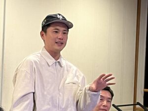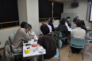 自分の教室を食べ物に見立てて教室紹介。ポップコーン、長期熟成味噌など「らしさ」を捉えた即興編集。「その心は?」と師範が合いの手を入れるたびに、ホウホウと頷くばかり。