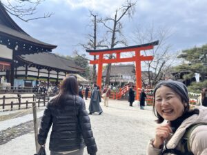 初詣の余韻が残る下鴨神社楼門がスタート地点。まずは、一年の平安と健康とともに編集稽古の幸先を祈る。