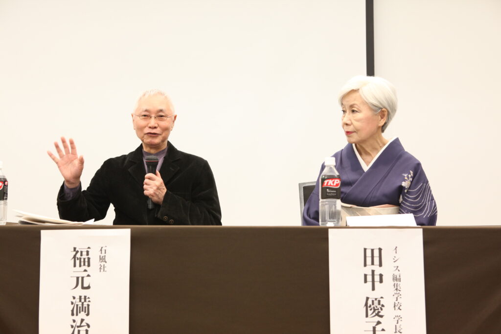 1部のイベントでは、東京からイシス編集学校の田中優子学長、福岡の出版社・石風社の福元満治さんをお招きしてトークセッションを実施した。田中学長と福元さんは30年ほど前に会ったものの、じっくり話すのは初めてという。