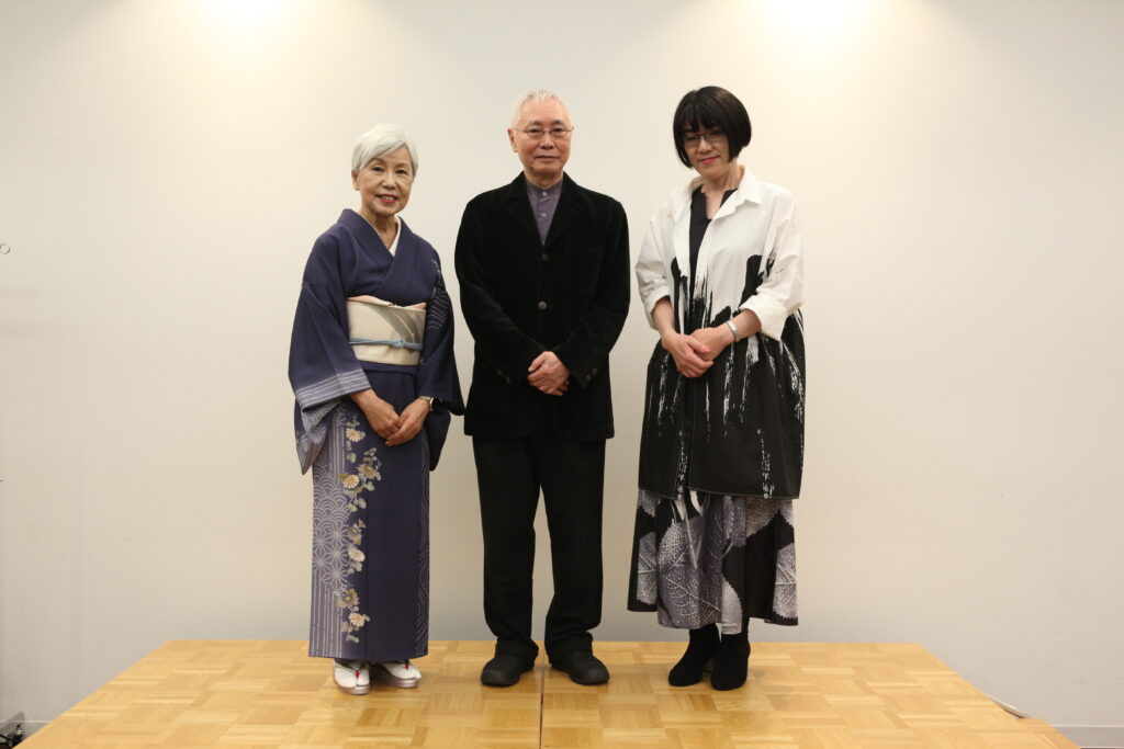 左から学長の田中優子さん、石風社の福元満治さん、九天玄氣組組長の中野由紀昌