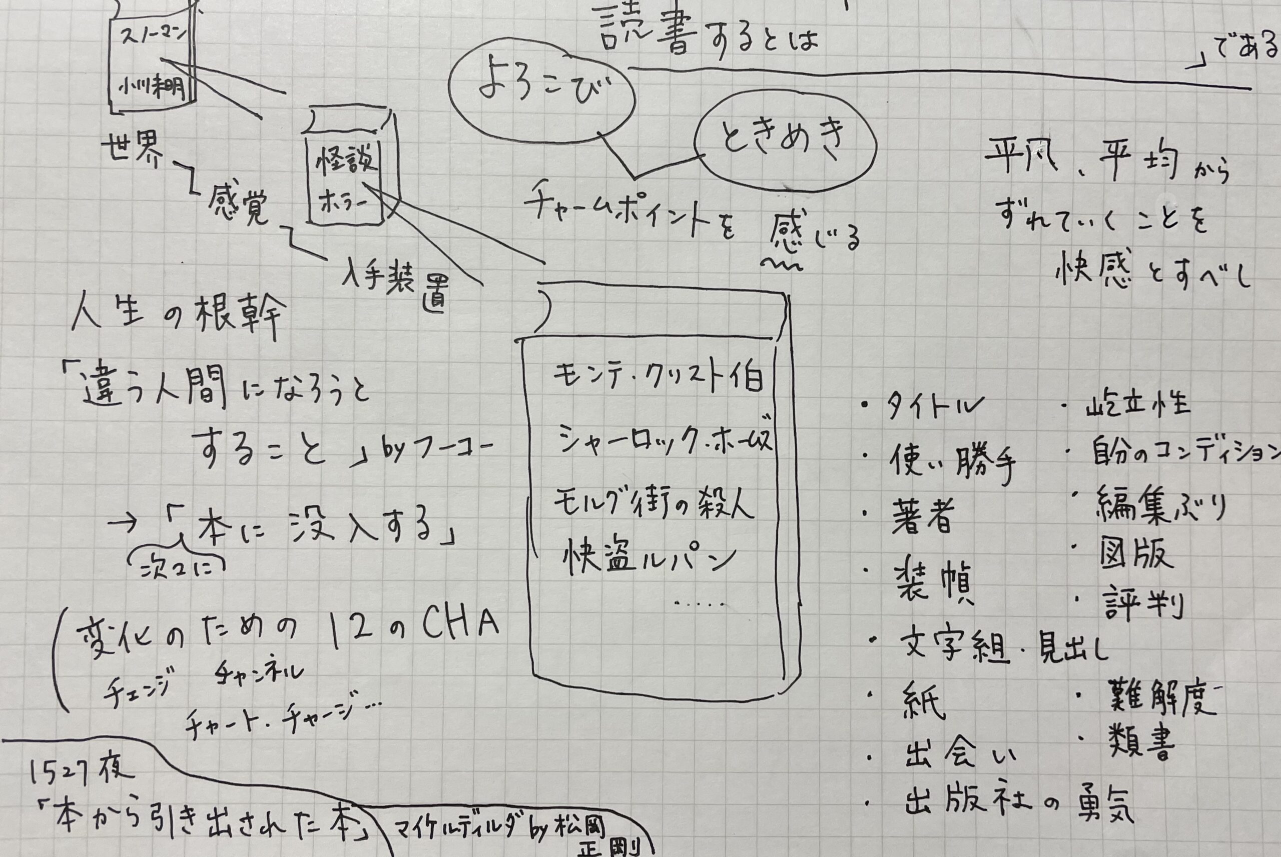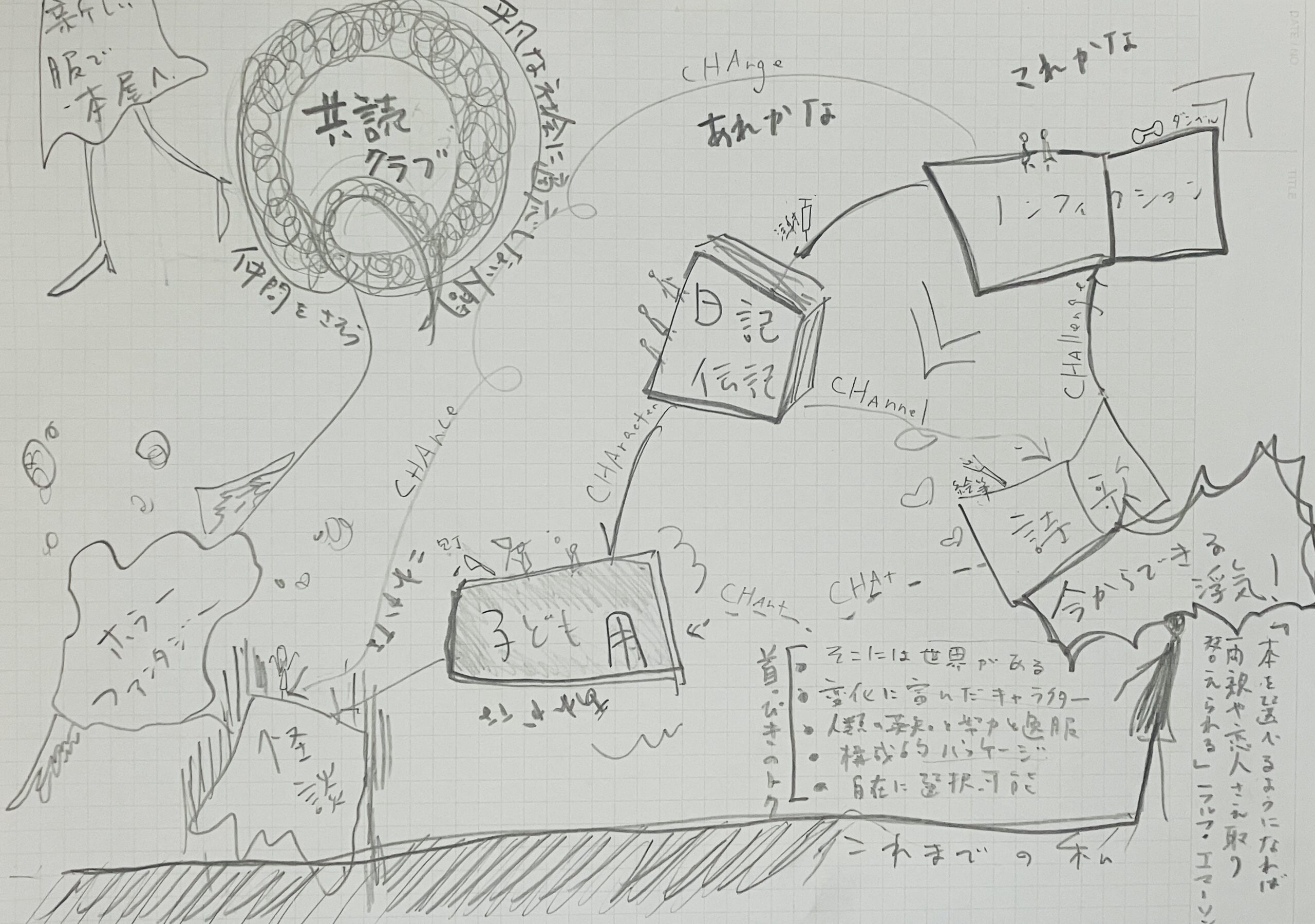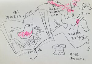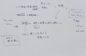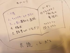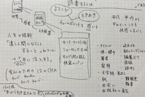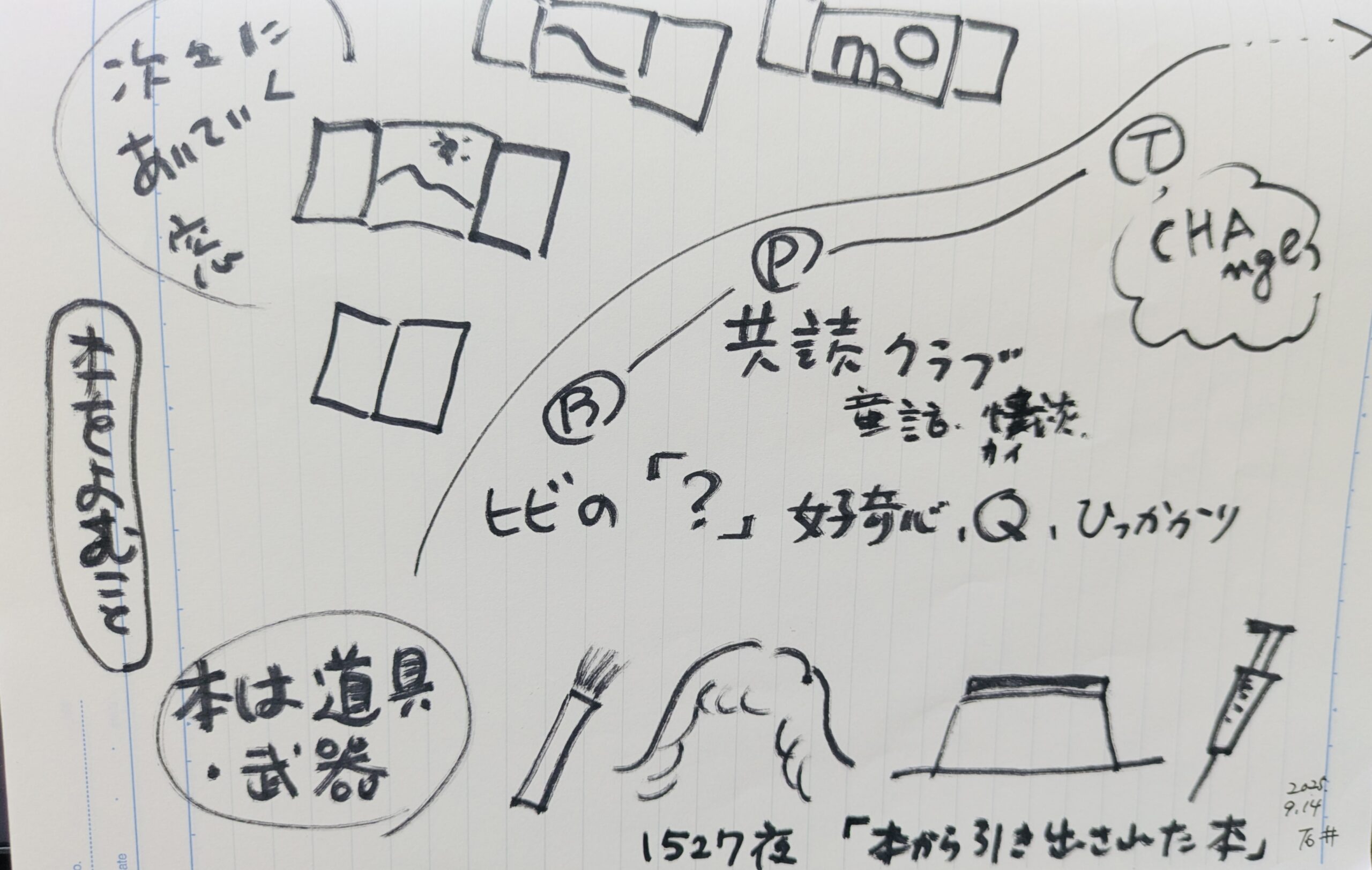 意外にも1527夜『本から引き出された本』マイケル・ディルダ。「よみ」と「かき」の往来を、果てしなく続く大空まで羽ばたかせてくれそうな千夜だ。この千夜から、なぜあのような発言が連発されたのか。共読会で書かれた図解とともに紹介しよう。ちなみにこの図解ワーク、所要時間は10分である。