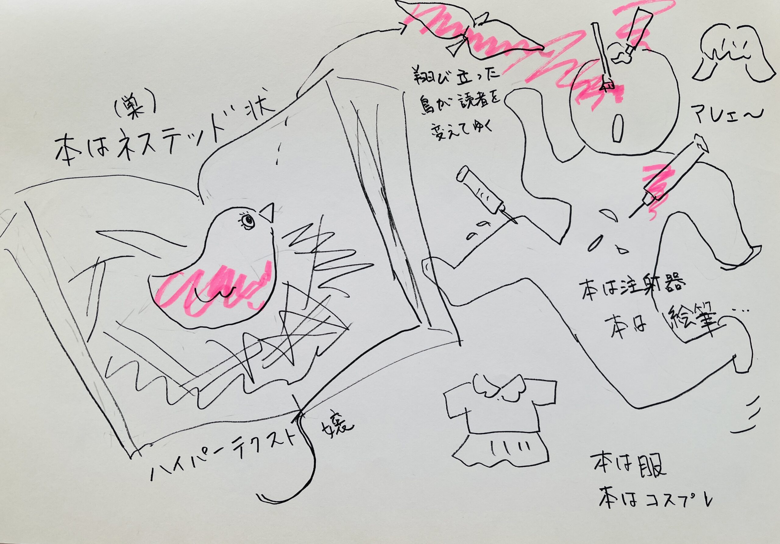 「本はネステッド」から、ネスト→巣→鳥と連想したのはQ人・三苫麻里。言葉の巣から著者のメッセージが孵化し、鳥になって飛び立つイメージだ。それは武器や絵筆や注射器に変容し、読み手に混じり(刺さり)変わっていく。ありのままの自分も大事だが、本を読むことで自己編集をかける攻めの姿勢にだってなれる。