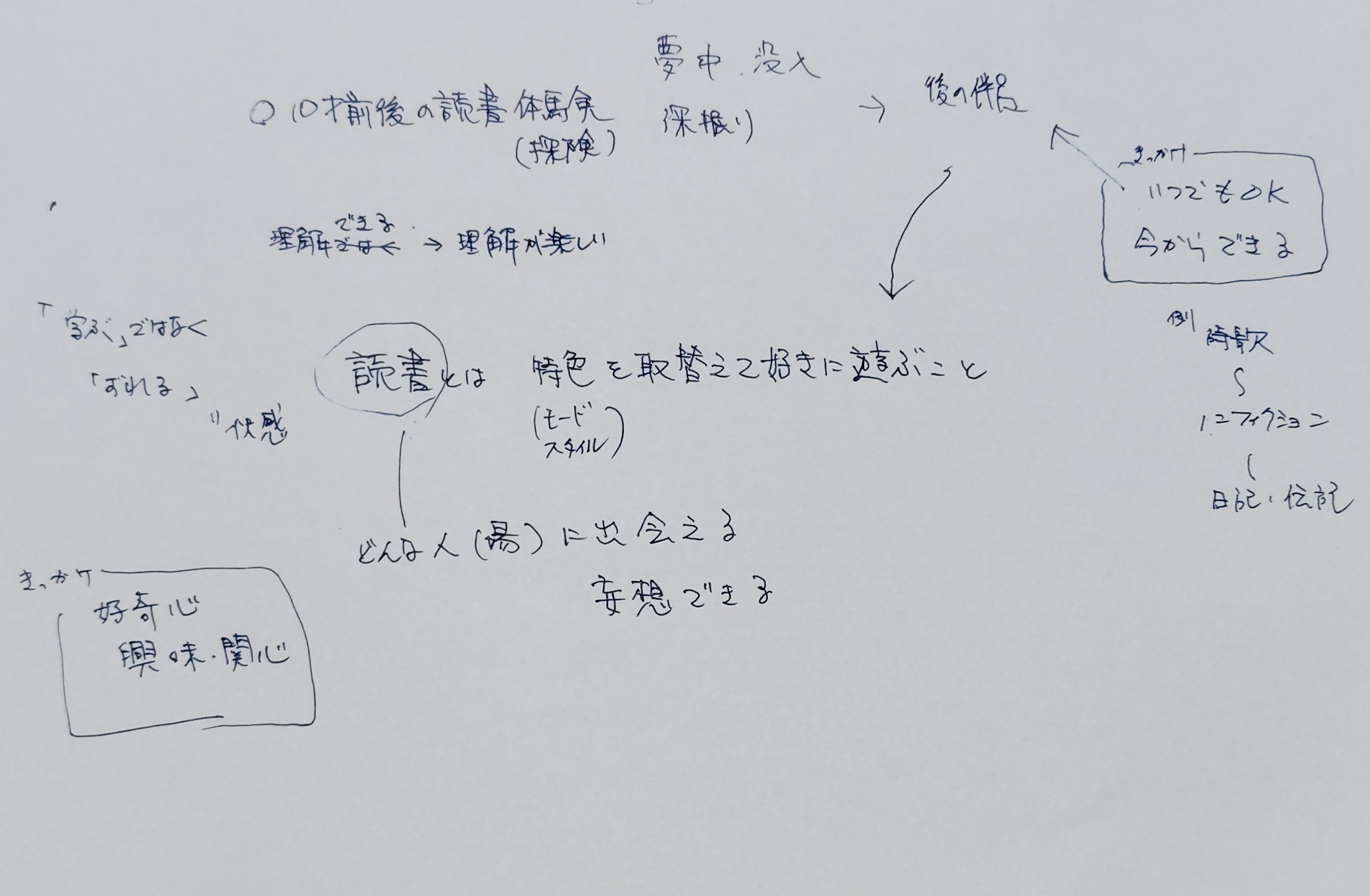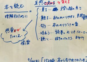 真ん中に本がある世界感覚入手装置に感銘を受けたのは書民の馬場朋子。本を手に取った子のトリガーはわからないが、共読すること、分かち合うことで、互いに思っているものが違うと気づくことがある。その気づきがA+Bではなく、A×Bの化学反応のようなことをおこしてくれる。自分の外に広がる受容突起があるのだ。