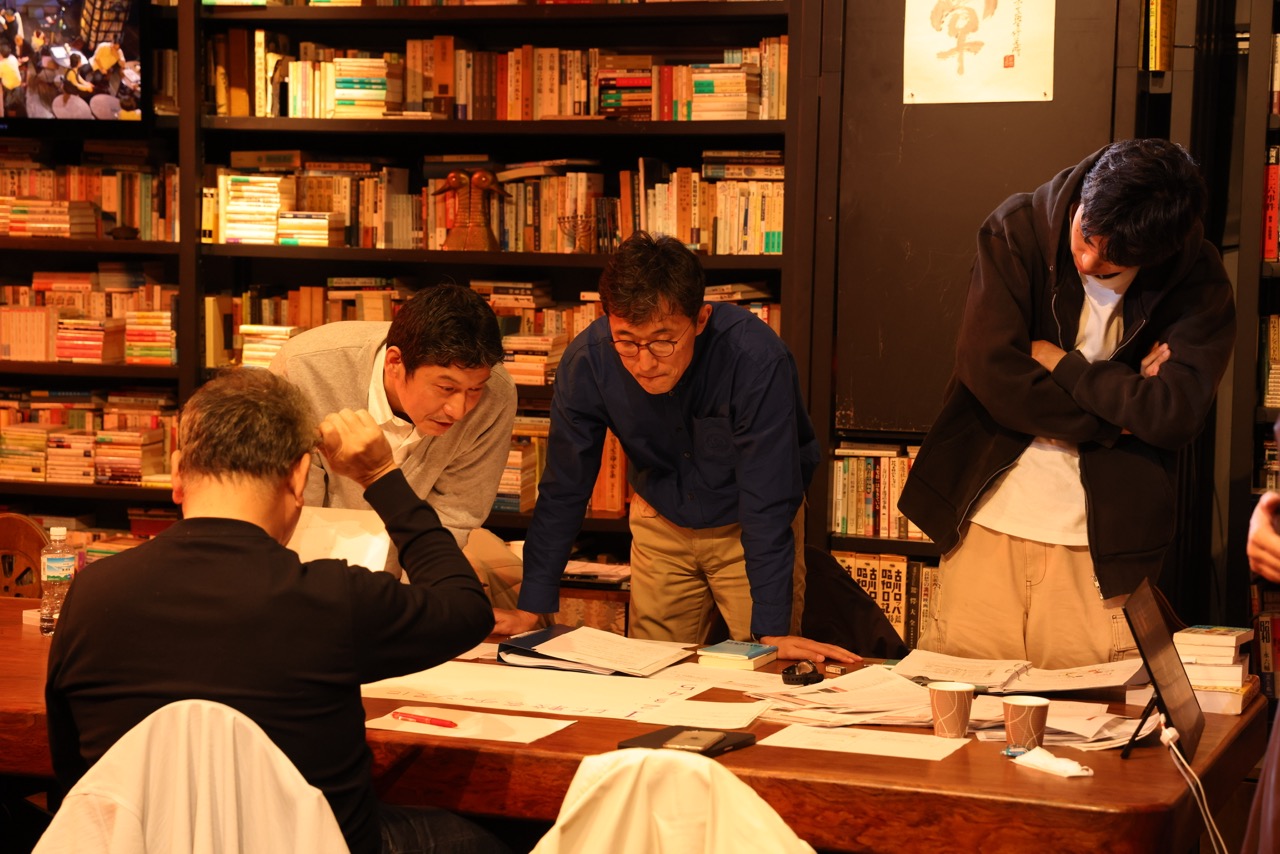 Kの新たな発想と連投に驚きながらも、熱意をキャッチし、言葉を重ねるむらさき道場の入伝生たち。「繊細で、淫靡で、神秘的、綾しい集団」がむらさき道場らしさだという発言も飛び出し、深夜まで交わし合いは続いた。