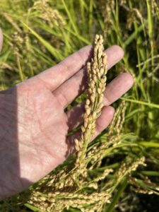 モーリス宅では、今年は出穂から45〜50日くらい、出穂から積算温度1000度くらいで稲刈りした。